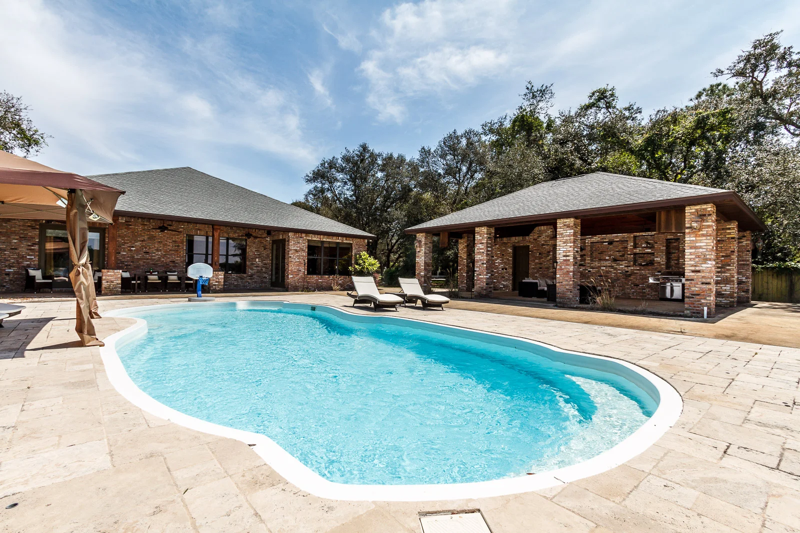 A rare opportunity to live on a large estate situated high atop a bluff in the heart of Destin with deep water slips and views of the bayou and the bay beyond. Follow the long, winding, tree lined driveway to this hidden craftsman style mansion and carriage house. The main house has three bedrooms and a large office that could be a fourth as well as a large den/media room and an open floor plan for the living, dining, and kitchen area. The carriage house has a complete one bedroom apartment with a full kitchen. However, the beauty is out back on the enormous back patio with a pool and covered entertainment area that has its own full bath and set up for 8 separate tv's. The dock is shared with the neigbor for deeper water. A boater and entertainer's dream.